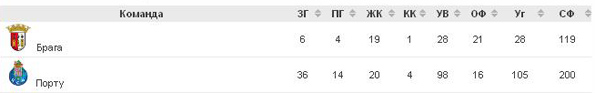 Поражение в ответном полуфинальном матче с «Вильяреалом» (2:3) оборвало пятиматчевую победную серию «Порту» в Европе. Статистика «драконов» в 16 матчах нынешнего евросезона такова: 13 побед, одно поражение, две ничьих, разница мячей 43:16. Путь к финалу для них начался с раунда плей-офф. «Брага» начала континентальную кампанию в третьем отборочном раунде Лиги чемпионов УЕФА. Сенсационно одолев «Селтик» и «Севилью», команда Домингуша Пасьенсии вышла в основную сетку. В 18 матчах на европейской арене «канониры» отпраздновали девять побед при трех ничьих, шести поражениях и разнице мячей 20:20. Оказавшись в 1/16 финала Лиги Европы после вылета из Лиги чемпионов, «Брага» в восьми встречах одержала три победы при трех ничьих, двух поражениях и разнице мячей 6:4. В среднем дружина Пасьенсии забивает раз в 120 минут и пропускает раз в 180 минут..jpg) ЗГ - забито голов, ПГ - пропущенно голов, ЖК - желтые карточки, КК - красные карточки, УВ - удары по воротам, ОФ - офсайды, УГ - угловые, СФ - совершено фолов.